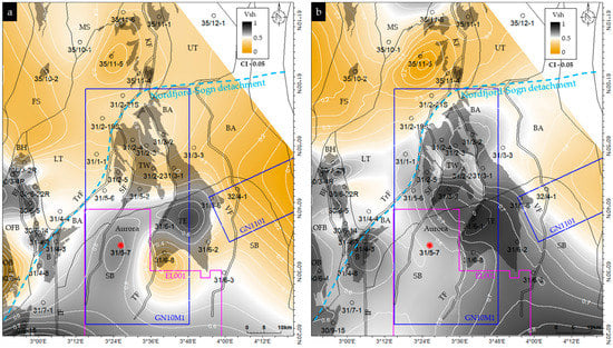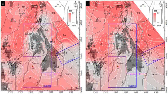 The property maps generated using the average well data of EBI of upper Drake (a) and lower Drake (b) units show the spatial variation of the caprock strength. The contour interval (CI) of each map is shown in the legend (0.025). Moreover, the grey shaded zones represent the oil and gas discoveries in the study area.