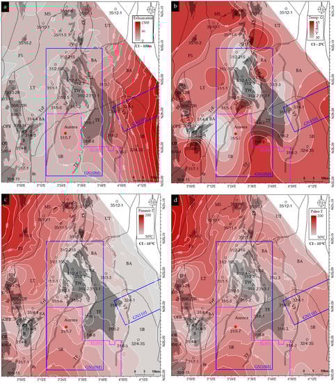 The average exhumation map (a) and temperature gradient map (b) for the study area show the differential uplift and temperature variations. The present (c) and paleo (d) temperature distribution maps of the lower Drake unit calculated using exhumation and temperature gradient analysis display the variation and the maximum temperature experienced by the caprocks in the study area. The paleo-temperature map on top of the caprock surface represents the mechanical and chemical compaction zones. The contour interval (CI) of all maps is shown in the legend.