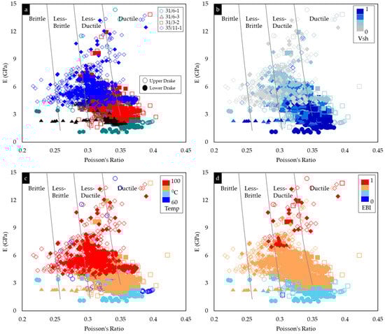 Young’s modulus versus Poisson’s ratio cross-plots of Drake Formation show the variations between upper (non-filled) and lower (filled) Drake units color-coded with well names (a), the volume of shale (b), temperature corrected for exhumation (c), and EBI (d). The reference background curves are adapted from Perez and Marfurt [].