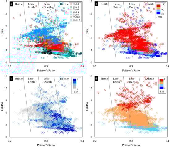 The diagenetic influences on geomechanical properties (E and PR) of the Drake Formation are illustrated in these cross-plots using the data points from 7 selected wells from the study area color-coded by well names (a), temperature corrected for exhumation (b), Vsh (c), and EBI (d). The brittle–ductile divisions are based on Perez and Marfurt [] published curves.