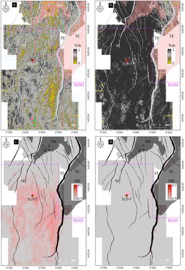 Lateral distribution of the volume of shale (Vsh) and elastic brittleness indices (EBI) were assessed. Both the shaliness and brittleness properties are indicators of the effectiveness of the caprock shale as a top seal. For instance, higher shaliness and lower brittleness represent better top seal quality and vice versa. The Vsh value significantly varied between the upper and lower Drake units, where the lower Drake represents a higher percentage of shale than the upper unit (Figure 15a,b). The upper Drake shale in the studied area is mostly silty; however, patchy distribution of the finer grain (higher Vsh value) is also present. North of the injection well location (31/5-7), the upper Drake caprock shale is mostly coarse-grained (Figure 15a). On the contrary, the lower Drake shale characterizes as fine-grained throughout the study area (Figure 15b).