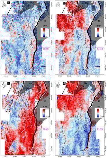 Variations of RMS amplitude on top of the upper Drake (a) and lower Drake (b) units are presented. Spatial variation of relative acoustic impedance (RAI) are also shown on upper Drake (c) and lower Drake (d) surfaces. Note that the faults (black), oil and gas fields (dark grey shaded polygons), the CCS license (EL001), and the proposed injection well (31/5-7) are also shown.
