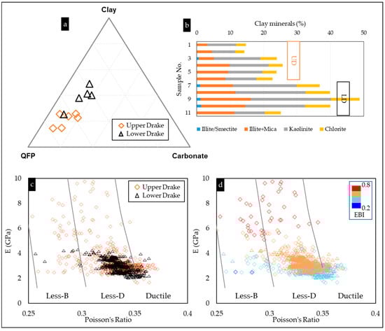 Bulk mineralogy from upper and lower Drake units from well 31/5-2 shows the upper and lower Drake unit variations of mineralogical composition (a) and clay mineralogy (b) []. The log-based geomechanical properties are color-coded with units from the same well (c) and EBI (d). The background curves are adapted from Perez and Marfurt [].