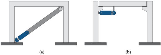 The assembly of the PS-LED consists of four main steps: (i) the lead core is cast in a hollow cylindrical mold with the outer and inner diameters resembling the diameters of the tube wall and the shaft, respectively; (ii) the lead core is fitted within the tube and the shaft is gently forced to pass through the lead core; (iii) the cap is locked to the tube wall by means of screws; by tightening the screws the lead core is prestressed and voids and clearances are removed, resulting in a perfect fit to the tube and the shaft; (iv) hinges are fitted to one end of the shaft and the opposite end of the tube to connect the damper to the structure. Possible configurations for installation of the PS-LED in a structural frame are based on placing the device within diagonal braces (Figure 3a), where the damper develops resistive forces against the brace elongation [], or at both sides of the web (Figure 3b), where the device develops resistive forces against the beam rotation [].
