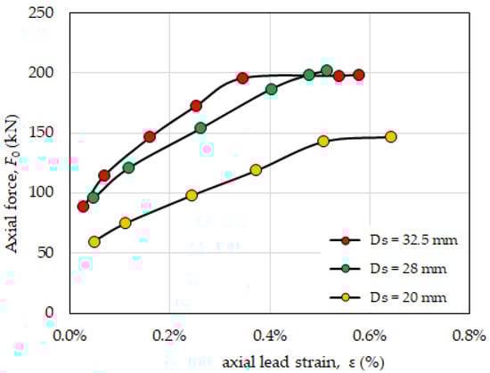 Axial load F0 of the PS-LED vs. axial strain ε of the prestressed lead core for different diameters of the shaft Ds.