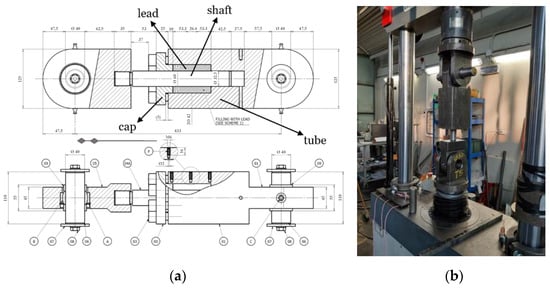 A prototype of the PS-LED has been experimentally assessed in this study. The exploded drawing of the prototype is shown in Figure 6, while the materials are according to the description given in Section 2.2. All components are made of 42CrMo4 quenching and tempering steel, except for the core which is made of 99.99% pure lead. The cap is fixed to the tube wall by means of eight M16 screws. The operational dimensions of the device are as follows: the shaft diameter Ds = 32 mm, the external diameter of the lead core Dl = 60 mm, and the length of lead core L = 80 mm. The design deflection of the prototype calculated for the basic design earthquake (corresponding to the life-safety limit state according to the Italian Building Code (IBC) []) is dbd = 20 mm in either direction. In order to avoid off-axis load, self-lubricating spherical hinges with a minimum rotation capacity of ±2° are provided at the two connection points, namely the bottom of the tube and the far end of the shaft. The total length of the prototype is 568 mm (433 mm between the center axes of the joints), and the external dimensions of the tube (with square cross-section) are 110 mm × 125 mm. During assembling, the lead core was prestressed by tightening the fixing screws of the cap to a torque of 212 Nm.
