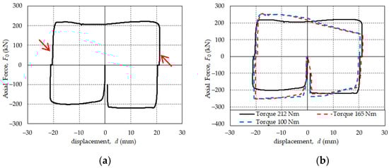 The force–displacement behavior of the PS-LED prototype observed in a fully reversed cycle with the maximum deflection dbd is illustrated in Figure 7. Figure 7a shows the hysteretic response of the prototype with fixing screws tightened to 212 Nm. An elastic deflection of the whole damper is initially observed until the breakaway friction resistance of the working material is overcome and sliding of the shaft relative to the lead core is eventually engaged. From this point on, the force–displacement curve shows a plastic branch characterized by an almost steady force independently of the accommodated deflection, and the same behavior occurs after each motion reversal. It is worth noting that owing to the high elastic stiffness of the steel members, which provide a high initial stiffness, the hysteresis loop has an essentially rectangular shape. The behavior of the device is symmetric in tension and compression, with similar values of the axial force F0 both in tension (N > 0, shaft mowing outwards) and in compression (N < 0, shaft moving inwards). The small changes in the output force at motion reversals suggest that the friction between the shaft and the lead has a shallow dependence on the velocity, though this dependency does not affect the overall response too much. The idle displacement observed after the motion reversal and highlighted in Figure 7a by the red arrows is ascribed to the clearance of the spherical hinges.