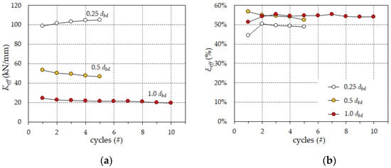 Variation of the properties of the PS-LED prototype in cyclic tests at different amplitudes: (a) the effective stiffness Keff; and (b) the equivalent damping ratio ξeff.