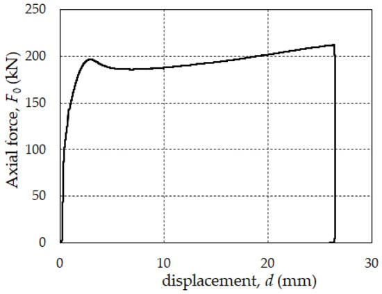 Figure 5 reports the axial force F0 of the PS-LED calculated for different values of axial strain ε imposed on the lead core and for different diameters of the shaft (the outer diameter of the core is 70 mm). The force increases almost proportionally with ε until a certain threshold is achieved, beyond which no further increase occurs. The strain threshold corresponds to the yielding of lead and determines the maximum stress that can be induced in the material bulk, which is in turn proportional to the friction force. As a first approximation, the axial force of the damper can indeed be calculated as the product of the friction coefficient µ1 between the shaft and lead times the bulk stress in the lead times the area of the shaft–lead interface. Though very simple, this analytical model justifies the linear dependence of F0 on the diameter of the shaft and the achievement of a steady force level beyond a certain strain observed in the finite element analyses. Eventually, it is worth noting that the steady value F0 = 200 kN of the PS-LED with 32.5 mm diameter predicted numerically is close to the experimental value of 220 kN measured on a prototype of a lead damper with a bulged shaft reported in [], thereby proving the effectiveness of the preload in controlling the friction force and the viability of the proposed design to achieve force and damping capabilities equivalent to the ones of the bulged shaft counterpart.