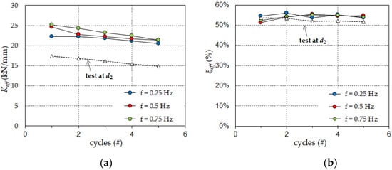 Variation of the properties of the PS-LED prototype in cyclic tests at different frequencies f with maximum deflection d2 (design deflection at the collapse ultimate limit state): (a) the effective stiffness Keff and (b) the equivalent damping ratio ξeff.
