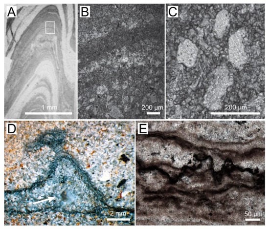 Textures in Archaean and Proterozoic microbial mats and stromatolites. (A) Photograph of a thin section of conical stromatolite from the 3 Ga Chobeni Formation, South Africa. The light areas contain silica, and the dark laminae contain dolomite. White rectangle outlines the area enlarged in panel (B). (B) Photomicrograph of laminae preserved by microcrystalline and microsparitic dolomite (dark). The lighter laminae contain pores filled by silica. (C) Enlarged view of silica-filled pores surrounded by 10–100 mm–thick dolomite laminae. (D) Photograph of a polished slab showing a tufted silicified mat in a sandstone from the Archean Moodies Group, South Africa [25]. The arrow points to a silica-filled void. (Reprinted with permission from ref. [25]. Copyright 2015 Elsevier) (E) Photomicrograph of the dark, organic-rich layers in a pustular silicified mat from the ~1600 Ma Proterozoic Balbirini Dolomite, Australia.