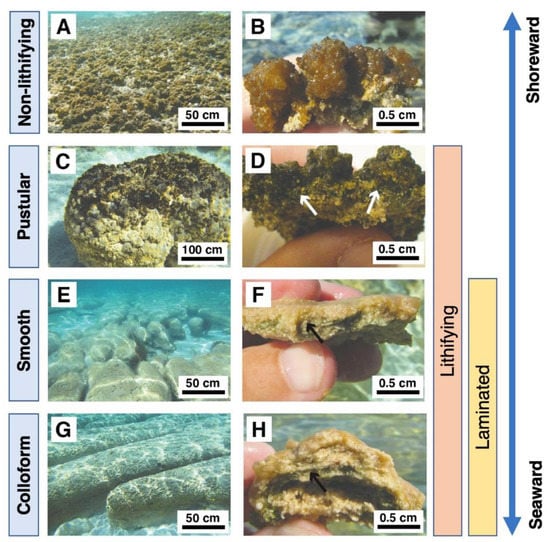 Modern mat types in Hamelin Pool, Shark Bay, Australia. Adapted from Babilonia, Conesa, Casaburi, Pereira, Louyakis, Reid, and Foster [47], under the license CC-BY 4.0. (A) Sheet of EPS-rich non-lithifying pustular mats in the intertidal zone. (B) Cross-section of EPS-rich non-lithifying pustular mat. (C) Pustular stromatolite-forming mat. (D) Cross-section of lithified pustular mat. (E) Lithified smooth mats (F) Cross-section of smooth mat showing laminations. (G) Lithified colloform mats have a bumpier surface texture and less fine laminations than smooth mats. (H) Cross-section of a colloform mat domal structure. Arrows in panels (D,F,H) indicate the cyanobacterial layers.