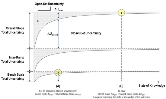 It would be impossible to begin a review of the applications of numerical models without asking the vexed question of whether numerical models can predict the future behavior of a rock mass. The word “prediction” is often used by researchers and engineers when describing the results of a series of numerical models, as if its use creates a shield of validity protecting the numerical model from critics. Predictions can be of a qualitative (e.g., type of failure mechanisms) or quantitative nature (e.g., the magnitude of deformation in a pit wall). Notwithstanding, any prediction claim, whether qualitative or quantitative, needs to face the reality of data uncertainty and data variability. The validity of any numerical analysis is strongly linked to the quality and quantity of the data used to derive the required input properties. However, in rock engineering design, collecting substantial amounts of data does not necessarily reduce uncertainty, since model and human uncertainty transcends the availability of factual data [12]. The same authors revised the concept of uncertainty as applied to rock engineering design to account for scale effects, which are ever-present in rock engineering design. Figure 1 shows the distinction between closed- and open-set uncertainty applied to pit slopes. When dealing with small scale problems (e.g., bench scale) and closed-set uncertainties, there is a point at which increasing the degree of knowledge of the rock mass would not change the design outcomes, since the impact of unknown uncertainty (unknown unknowns) is built in the design criteria by, for example, accepting a relatively large probability of failure (up to 50% for bench failure as reported in [13]). This condition is represented by Point A in Figure 1. However, pit-to-cave transitions represent large-scale rock engineering problems; as such, they belong to the domain of open-set uncertainty. Therefore, for an equivalent state of knowledge (A), we cannot exclude a priori the impact of both known and unknown uncertainty on our aggregate knowledge of the rock mass. Reducing the impact of open-set uncertainty to a level equivalent to that of bench scale problems would require a significant increase in our rock mass knowledge (Point B in Figure 1).