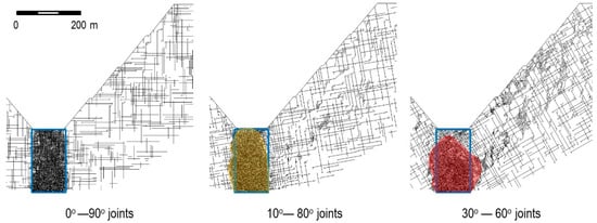 In general terms, the range of rock mass conditions where continuum modelling can be applied is limited compared to discontinuum and hybrid modelling. Nonetheless, the use of continuum models is more established due to their computational advantage (run times). We could argue that the habitual use of continuum models, in combination with equivalent continuum properties calculated using the Hoek–Brown/GSI approach creates, in the words of Kahneman [31], an “Illusion of Validity”. Rather than accepting the limitations of continuum models applied to study the behavior of fractured rock masses, we keep propagating the same justifications (faster computing times, 3D conceptualization) to justify it as an alternative to discontinuum and hybrid models. Continuum modelling trades structural complexity for geometrical simplicity (Figure 3), thus identifying the material parameters associated with specified constitutive equations for the equivalent continuum [17]. Figure 4 shows the impact of joint orientation on the stability of a slope following the caving of a 200 m high orebody, modelled using a hybrid method (modified from [5]). The results show that both cave development and subsequent slope behavior are controlled by the underlying rock mass fabric. It becomes apparent that modelling the behavior of a fractured rock slope by ignoring structural features and relying exclusively on an equivalent continuum approach without proper consideration of the impact of a “continuum homogenization process” may change the outcome in terms of the simulated rock mass behavior. The use of a ubiquitous joint approach can help circumvent this limitation (e.g., [7]).