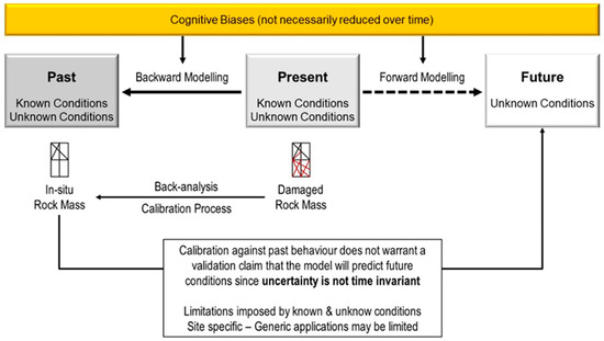 Back-analysis (backward modelling) is another common reason for pursuing numerical models. Back-analysis is generally applied to study failures that were not predicted by models in the first place. For example, in the case of the Palabora pit failure in 2004, several types of models were used in analyzing the cause of the failure and how the underlying cave caused the instability (e.g., [33,34,35,36,37]). The value of back-analysis is in knowledge creation by understanding and revealing failure mechanisms that might have been ignored or miscalculated in initial models. However, back-analysis does not solve the problem of unknown uncertainty [12], and calibrating models based on experience and understanding of other failures at the same mine site may not guarantee that a model would be able to predict the impact of future failures. In other words, back-analysis does not warrant that a validation claim based upon matching modelling results with observed field conditions could be extended to forward models and future events. As a result, if a certain modelling approach has been able to successfully back-analyze conditions at a given site, it does not justify that the same modelling parameters would be able to predict future conditions at the same site or, even more challenging, at another site where the geological conditions and failure mechanisms may be quite different (Figure 6).