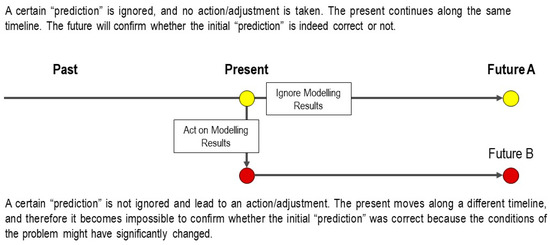 In this context, we could ask ourselves the difficult question of how many large-scale mine models completed as part of pre-feasibility and feasibility studies, when data availability is limited, have “predicted” results that agreed with observed field conditions once the mine had become operational. We argue that the objective of those forward-looking models should not be to predict rock mass behavior accurately and quantitatively but rather to frame and classify rock mass behavior under different conditions and different levels of uncertainty. This subject warrants a broader discussion on what is the role of predictions in rock engineering. How can we validate “predictions” made by a numerical model (or a machine learning algorithm, for that matter) if the “prediction” is used to change the mine design? Arguably, by changing the design (present state), we are changing future outcomes, and therefore the conditions upon which the initial “prediction” was made no longer apply (Figure 7). Decisions concerning the stability of the structure in rock are based on financial constraints, as opposed to solely geotechnical reasons, which further demonstrates the concern of the use of numerical models as investigative tools to assess risk and evaluate the impact of different unknowns.