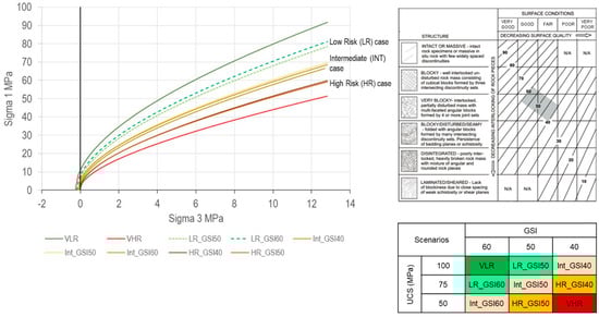 With reference to Figure 8, it is worth noting that the estimated GSI/Hoek–Brown approach yields similar failure envelopes for rather different combinations of UCS and GSI, which is the result of the underlying continuum homogenization process discussed earlier in Section 2.2.