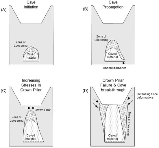 Caving mechanisms are based on the premise of failure of the rock mass. At shallow depth, caving is controlled by gravity loading and the degree (frequency and surface appearance) of jointing. On the other hand, the caving of massive and veined deposits at depth is governed by induced stresses (magnitude and orientation). The development of the undercut drifts causes a decrease in vertical stress and an increase in horizontal stress, with the difference magnitude determining whether sufficient rock mass yielding will result in cave initiation. Removal of the caved material (production) creates continued caving propagation, provided the differences in horizontal and vertical stress remain high (stress-driven caving at depth) or whether the tension due to gravity is sufficient to cause the collapse of the jointed rock mass (shallow deposits). Note that in the literature, the latter mechanism is often referred to as “gravity caving” to highlight the role of gravity loading in determining rock mass failure. Cave propagation behavior has been detailed by [52,53], while cave propagation under an open pit has been summarized by [5,8,47].