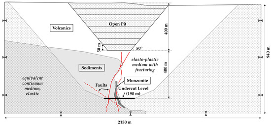 The 2D FDEM model geometry and material inputs have been modified from studies completed for an undisclosed caving mine. The primary modified model geometry, as presented in Figure 10, comprises a caving operation that is 400 m below a 400 m deep open pit with an overall slope angle of 50°. The caving undercut level is 190 m in width with an initial excavation height of 1 m. The entirety of the model measures 2150 × 940 m, subdivided into elastic and elastoplastic regions with fracturing. The non-fracturing, elastic region is required to minimize boundary effects and is modelled with a lower mesh resolution. The open pit is modelled elastically and excavated in 8 × 50 m stages. Mesh resolution varies at 1 m within the undercut level, 2 m above the undercut up to the pit bottom, and increases to 40 m near the model boundaries. Model geometry variations described in Table 2 are illustrated in Figure 11.