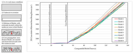 Cave propagation is caused by the removal of fractured material on the production levels. Simulating this process in FDEM models requires a series of deletion algorithms, which remove mesh elements whose centroids enter a specified region within the undercut level. The iterative deletion process, defined by specific numerical time values, was adapted from a calibrated mine production schedule of the undisclosed mine. Deletion times ranged from every 2–3 model seconds, varying between undercut level areas and the caving stage. The conceptual method of deletion for cave propagation is illustrated in Figure 12, along with the production volume (described as 2D area) for each model at comparable stages. Elmo et al. [6] describe the calibration process for the deletion algorithm to produce equivalent results in 2D compared to 3D production targets. For back-analysis models, the draw sequence and timing are calibrated to production volumes. This approach requires little user intervention, as the modeler is controlling only the deletion timing to attempt to match production, not the fracturing within the model or forcing production to occur. In this case, we adapted a previously calibrated draw sequence and timing to maintain a realistic draw, but with conceptual forward modelling and various scenarios, these models now differ from the calibrated versions and are no longer calibrated themselves.