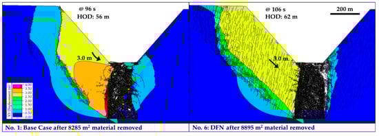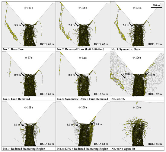Models defined as elastoplastic with fracturing only (i.e., no DFN) developed large unrealistic tension cracks on the surface and in the pit walls (No. 1–5, No. 9). This was expected and is not an uncommon result when simulating caving mechanisms using either discontinuum or continuum models in which there is no pre-defined fracture network to release the strain associated with caving-induced deformation. The impact of the addition of the DFN is explored in greater detail in Figure 14, Figure 15 and Figure 16. Detailed comments on the results of all models are summarized in Table 5.