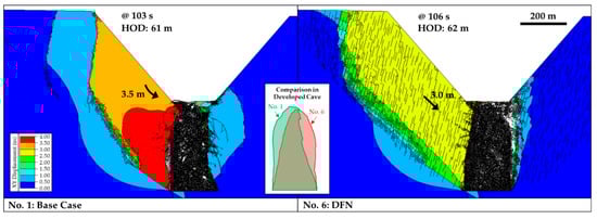 FDEM model results for models No. 1 and No. 6 with similar displacement in left pit wall. Maximum XY displacement contours.