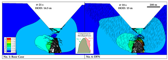 FDEM model results for models No. 1 and No. 6 after 8900 m2 ± 1% material removed. Maximum XY displacement contours. Developed cave shape comparison defined by 10 m vertical displacement.