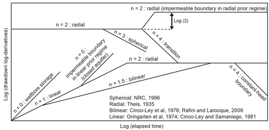 Several field investigation studies have reported that the flow regimes occurring in real media are actually much more complex and diversified than what is modeled by the simple radial flow regime [14,15,16,17,18,19,20,21]. To overcome this issue, some pioneering publications [22,23,24,25] have improved the interpretation of transient hydraulic tests by introducing a diagnostic plot approach that typically combines the logarithmic derivative of the drawdown () as reported by Bourdet, Whittle, Douglas and Pirard [24] and the flow dimension parameter () conceptualized by Barker [26].