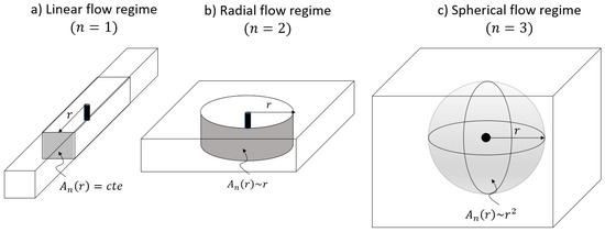 The generalized flow equations are developed using a system of -dimensional spherical surfaces centered on a common point that represents the source or the well [31]. The areas of these surfaces vary with distance from the source according to Equation (3), in which is the area of a unit sphere in -dimension [26]. For instance, in the linear flow regime (), the equipotential surfaces are constants while in radial () and spherical () flow regimes, is proportional to and , respectively (Figure 2).