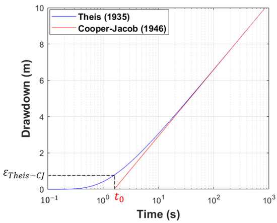 The approach based on the CJA considers the pressure front as the limit beyond which the drawdown is zero. The aquifer conceptual model of this approach derives from that of Theis, which assumes a two-dimensional groundwater flow occurring in a homogenous, isotropic medium of constant thickness with an infinite extension and the source has infinitesimal radius. The drawdown solution proposed by Cooper and Jacob [9] results from approximating the Theis well function to a straight-line for large dimensionless time. Chapuis [59] stated that the Cooper–Jacob approximation is tolerable for ; indeed, critical values equal to and are commonly practiced in hydrogeology applications [60,61,62].