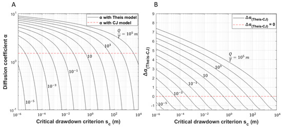 (A)—Comparison of α values from Theis and CJ models; (B)—Representation of estimation error of CJ model compared to estimation from Theis model.