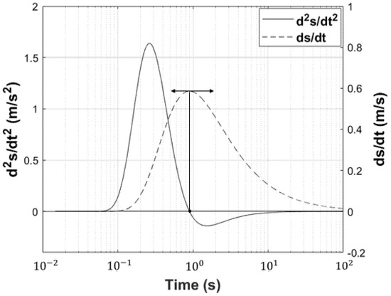The maximum drawdown rate approach consists of characterizing the diffusion equation using the drawdown derivative function (). This approach considers the pressure front as the pic of the function [66]. In other words, it finds the moment at which the second derivative of the drawdown function is zero () as illustrated on Figure 5. Assuming classic constant flow pumping test occurring in an aquifer formation that verifies the Theis hypothesis, the second derivative of the drawdown function is given by Equation (26). Then, taking Equation (26) and setting it equal to zero leads to obtaining Equation (27).
