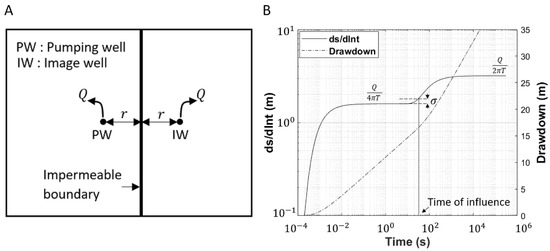 Both drawdown and log-time derivative signals are represented in Figure 8B. The time of influence () can be defined as the time at which the influence of the impermeable boundary starts to be felt in the real well. Then, in long time periods before the influence of the impermeable boundary is felt in the real well (), the natural behaviour of the aquifer dominates; thus, the term becomes negligible and .