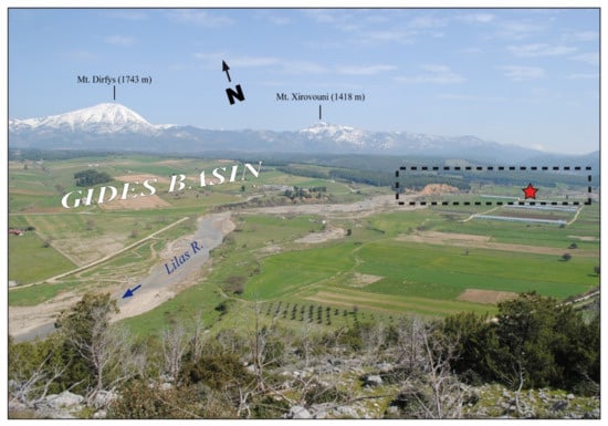 The geology of the catchment (Figure 1) can be divided into four zones [32]: The Dirfys/Xirovouni mountain range is formed from metamorphic (black schists, phyllites, marbles, and flysches) and carbonate rocks (pre-Neogene); the Gides basin (study area; Figure 2) is composed of Pliocene lacustrine to fluvio-lacustrine deposits, and characterised by deep gullies cut into this poorly consolidated substrate; further west and southwest, the Lilas dissects a hilly range comprised of Mesozoic ophiolites and limestones (Figure 1); and by the coast, Late Quaternary fan deltas formed directly in response to sea-level oscillations during the Pleistocene and Holocene.