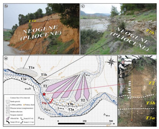 (a) Morphostructural mapping and terraces geometry. Topographic information is derived from 1:5000 scale maps. The red line indicates the position of the cross section revealing the terraces T3a, T3b and T2 (Figure 4); the red star indicates the position of the studied profile (d); Pliocene terraces are reported on (b,c).