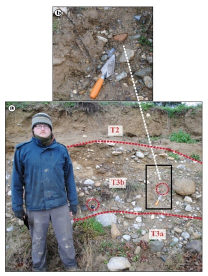 Cross section within the alluvial terraces deposits situated on the right bank of the Lilas river; refer to Figure 3a for exact location; (a) view of the different levels of alluvial terraces; (b) presence of rounded archaeological material (approx. 5 cm in length and of orange colour) embedded within alluvial terrace T3b sediments (in the picture: A. Bicket).