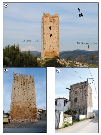 - Loizou, C. The Medieval Towers of Euboea: Their Dimension as Domestic and Landscape Phenomena. In An Island between Two Worlds. The Archaeology of Euboea from Prehistoric to Byzantine Times; Tankosic, Z., Mavridis, F., Kosma, M., Eds.; Norwegian Institute at Athens: Athens, Greece, 2017; Volume 6, pp. 625–638. [Google Scholar]