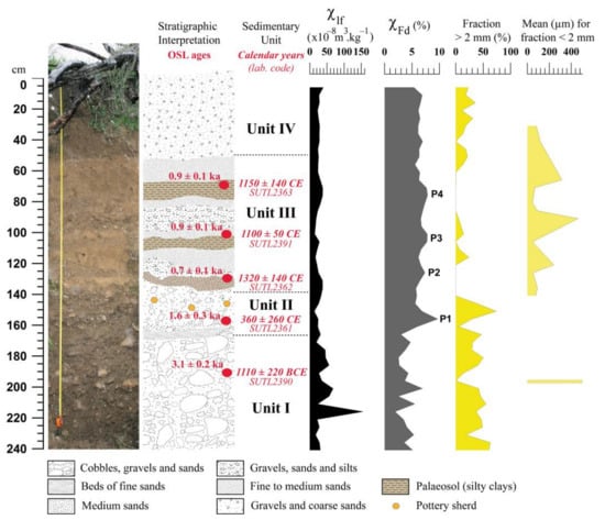 Sedimentary Unit III/Lower-Mid Terrace T2 (140–50 cm in profile) is composed of fine-grained sediments, ranging from fine silts to medium-coarse sands (500 µm), with two intercalations of gravels from 1.25 to 1.20 m and 0.95 to 0.80 m respectively. Compared to Units I and II, unit III shows stratification in the fine-grained layers identified at 1.25, 1.00, and 0.65 m, revealing constant and low energy of deposition. The magnetic susceptibility signal is similar to unit II, with values generally less than 40 × 10−8m3⋅kg−1, with minima at the gravel horizons (10 × 10−8m3⋅kg−1). Frequency dependence is relatively constant, oscillating between 7 to 8%, with maxima in the dark brown horizons (palaeosols P2, P3 and P4; Figure 7) composed of silty sands and fine sands (mean grain size is around 100 µm). Three samples were collected for OSL dating at 1.30, 1.00, and 0.70 m, from fine-grained horizons within Unit III (SUTL2362, SUTL2391, and SUTL2363; Figure 7 and Table 2).