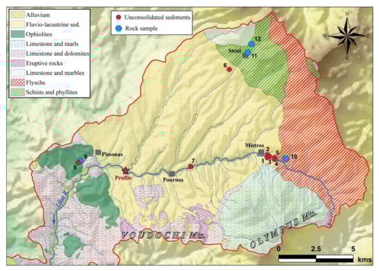 The bedrock lithology in the northern and eastern upper reaches of the Lilas catchment is characterised by a prevalence of metamorphic rocks (Figure 1), mainly composed of schists, phyllites, and marbles, and by limestone in the SE catchment. Magnetic susceptibility measurements were undertaken (sampling sites number 10, 11, and 12; Figure 8), and they generally exhibit a very low signal, generally centred around 10 × 10−8m3⋅kg−1, while the frequency dependence also reveals low values, situated around 1.5 and 3%, suggesting a relatively low contribution of the superparamagnetic particles. Neogene fluvio-lacustrine sediments characterising the Gides basin (sampling site number 6; Figure 8) exhibit a low signal of 10 × 10−8m3⋅kg−1, while χfd is about 5%. Mid-stream ophiolites in the area of Pissonas-Drako Spilio (sampling sites number 8 and 9; Figure 8) reveal a high χlf with values situated around 800 × 10−8m3⋅kg−1. The southern upper reaches were not investigated at this stage, but the presence of eruptive rocks in the eastern part of the Voudochi Mountain range could be associated with the reworking of magnetic particles eroded due to the incision of Lilas river tributaries (Figure 8).