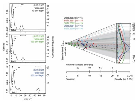 Initial screening measurements were made using a Risø DA-15 luminescence reader on paired discs of quartz and polymineral concentrates. Full dating measurements were made using the same equipment but on HF-etched, 150–250 µm quartz fractions. Equivalent dose determinations were made on 16 aliquots per sample using an OSL SAR procedure [89]. We recognise that the number of aliquots measured was low; however, the laboratory profiles provide a further constraint on the distributions in equivalent dose. Equivalent dose distributions were assessed using a combination of statistical methods developed for luminescence dating and using Kernel Density Estimate and Abanico Plots (Figure 5). Dose rate estimates for these sediments were assessed using a combination of high-resolution gamma spectrometry (HRGS) and thick source beta counting (TSBC), which were reconciled with each other in a micro-dosimetric model, and attenuated for water content and grain size. The contribution from the cosmic dose was modelled after Prescott and Hutton [90].