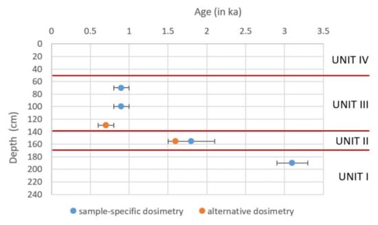 The samples were also characterised by heterogeneity in radionuclide concentrations, with K concentrations in the range of 2.0 to 1.3%, U concentrations of 2.6 to 1.9%, and Th concentrations of 9.3 to 6.1 ppm. However, there was a strong correlation between the position in the stratigraphy and radionuclide concentration, with the samples at depth marked by lower concentrations (i.e., K 1.3%, U 1.8 ppm, Th 6.9 ppm) than the samples at height (i.e., K 1.9%, U 2.4 ppm, Th 9.3 ppm). Infinite matrix dose rates were calculated from these using the conversion factors of Sanderon [96] and adjusted for attenuation by grain size and chemical etching using the datasets of Aikten [97] and Bell and Zimmerman [98], respectively. These were reconciled with the measured beta doses (TSBC) rates and an estimate of the cosmic dose contribution in a dosimetric model to obtain total environmental dose rates. The total dose rates varied with position in the stratigraphy, with lower values at the base of the section, 2.1 mGy a−1 to higher values at the top, 3.4 mGy a−1.