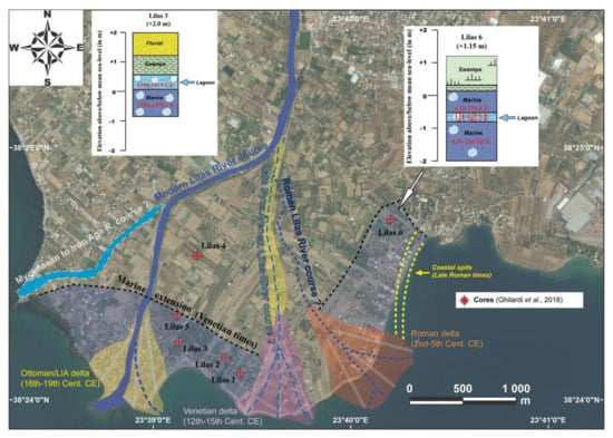 - Ghilardi, M.; Vacchi, M.; Currás, A.; Müller Celka, S.; Theurillat, T.; Lemos, I.; Pavlopoulos, K. Géoarchéologie des Paysages Littoraux le Long du Golfe Sud-Eubéen (île d’Eubée, Grèce) au Cours de l’Holocène. Quaternaire 2018, 29, 95–120. [Google Scholar] [CrossRef]