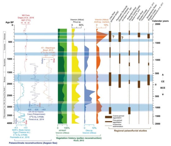 - Weiberg, E.; Unkel, I.; Kouli, K.; Holmgren, K.; Avramidis, P.; Bonnier, A.; Dibble, F.; Finné, M.; Izdebski, A.; Katrabtsiotis, C.; et al. The Socio-Environmental History of the Peloponnese during the Holocene: Towards an Integrated Understanding of the Past. Quat. Sci. Rev. 2016, 136, 40–65. [Google Scholar] [CrossRef] [Green Version]