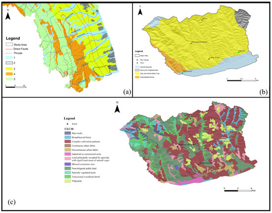 (a) Schematic geological map of the southern part of Marche region (Pierantoni et al., 2013 [69]): 1—main continental deposits (Pliocene–Pleistocene–Holocene); 2—sands and conglomerates (Pliocene–Pleistocene); 3—clays and sands (Pliocene–Pleistocene); 4—arenaceous–marly clayey turbidites (late Miocene); 5—limestone, marly limestone, and marls (early Jurassic–Oligocene). (b) Geologic map of the study area. (c) CORINE Land Cover map.