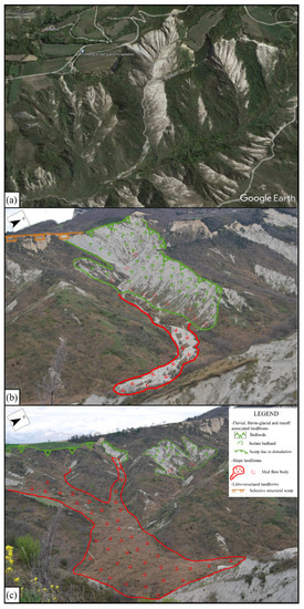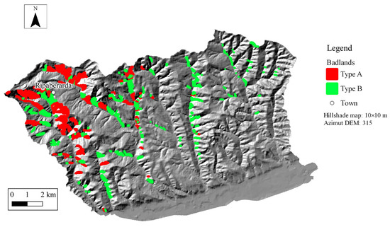 The morphological classification of badlands was carried out following the classification developed by Moretti and Rodolfi [50], who divided the landforms into type A and type B. In addition, in order to find a correlation between the morphology and lithology, the mapped badlands were classified from a lithological point of view using a litho-structural map at 1:10,000 [69].