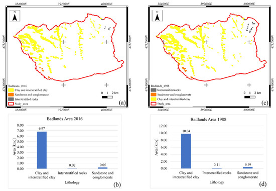 Badlands inventory in 2016 (a), lithology distribution in 2016 (b), badlands inventory in 1988 (c), and lithology distribution in 1988 (d).