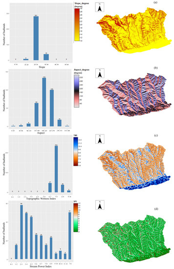 Subsequently, the most import morphometric indices linked to badlands erosion (e.g., [8,70]), such as the slope, aspect, Topographic Wetness Index, and Stream Power Index [71] values, were derived from a digital elevation model (DEM) with a 10 × 10 m cell, which was freely downloaded from the INGV website (http://tinitaly.pi.ingv.it/) (accessed on 19 November 2021).
