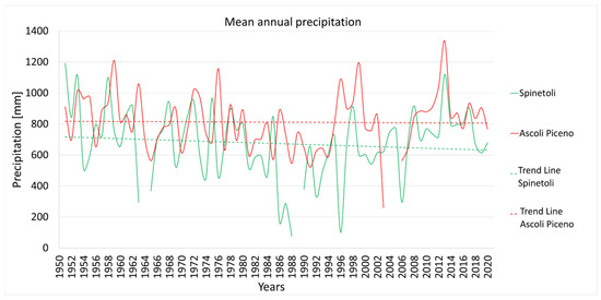 Annual mean precipitation for Spinetoli and Ascoli Piceno stations.
