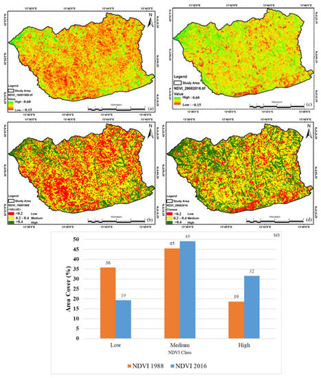 Spatial distribution of NDVI values for the analyzed periods: (a,b) NDVI values and NDVI classes in 1988 and (c,d) NDVI values and NDVI classes in 2016. (e) Percentage of area in each year.