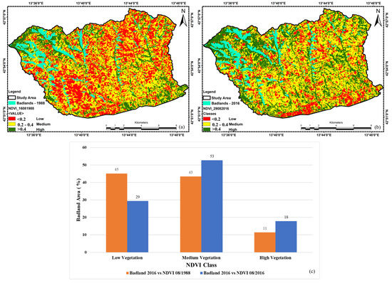 The NDVI index, on the other hand, shows a discrete increase in the presence of vegetation from 1988 to 2016 (about 17.8%). The NDVI images were classified into three classes as follows [81,82,83,84]: (i) no vegetation for values less than 0.2; (ii) medium vegetation for values between 0.2 and 0.4; (iii) dense vegetation cover for values of more than 0.4. The analysis showed that in general, the spatial extent of green cover in the study area increased from 108 km2 in 1988 (Figure 11a,b) to 135 km2 in 2016 (Figure 11c,d). In particular, the dense vegetation cover (class 3) increased in the study area from 31 km2 (19%) in 1988 to 52 km2 (32%) in 2016 (Figure 11e). The same figure shows that the class of low vegetation (class 1) areas decreased from 36% of the total investigated area in 1988 to 19% in 2016 (Figure 11e). Moreover, the green vegetation was enhanced within the badlands areas (Figure 12a,b). The area of dense vegetation increased from 1988 to 2016, from 11% to 18% of the total badland areas, while the low-vegetation areas in badlands have decreased from 45% to 29% (Figure 12c).